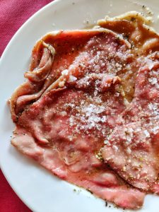 Nosotros probamos la esqueixada o ensalada de bacalao y el carpaccio de ternera de primero y el rabo de toro y la butifarra con mongetes (alubias) y patatas de segundo. Como postre, nos decantamos por un flan de mató y un postre con nata, chocolate y caramelo buenísimo y casero que hacen allí.