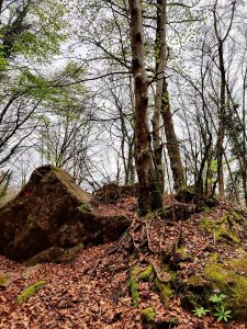 Unos cinco minutos después de la última bifurcación nos encontraremos con una ligera señal de dos puntos rojos en un árbol de doble tronco y una zona con piedras. Debemos subir por ahí.